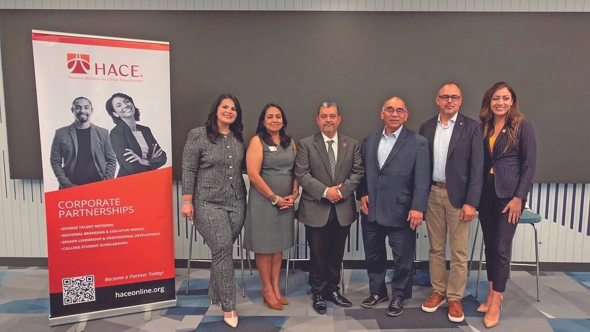 (L-R) HACE alum Muñeca Torres-Rivera, Executive Assistant to the President, Dallas College; Alicia Serrato, Executive Director, Primos Dallas; Dr. Macario Hernandez, President, Dallas College; Ray de los Santos, LULAC Dallas; Mario Sanchez-Lara, Cummins, Inc., and Patricia Mota, President & CEO, HACE.
