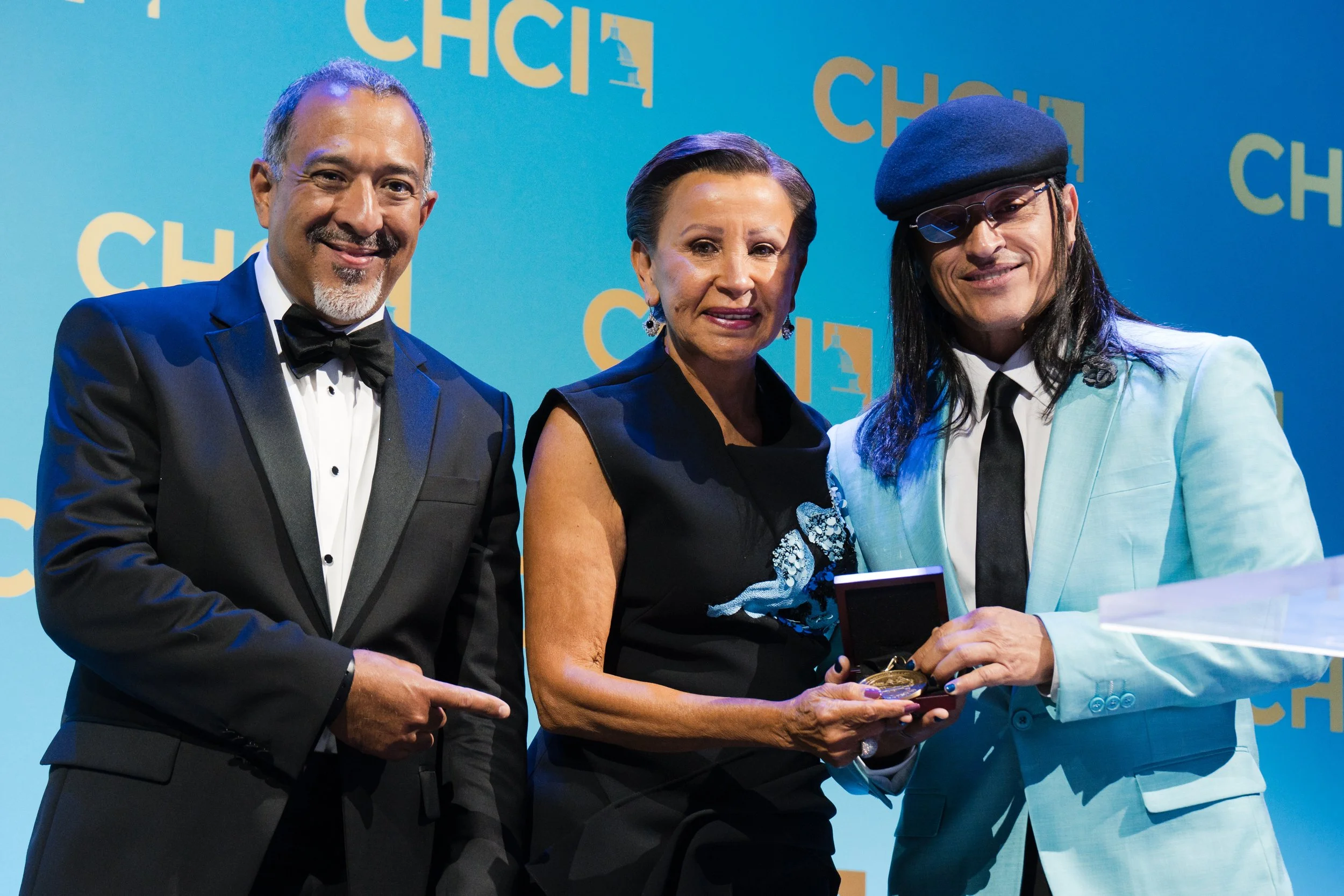 CHCI Medallion recipient and Gala performer Elvis Crespo receives the award from Rep. Nydia Velázquez and CHCI Board Vice Chair Leo Muñoz.