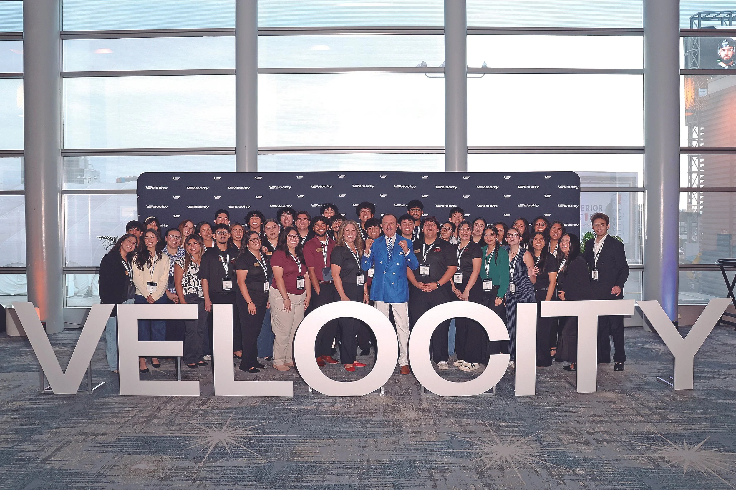 Sol Trujillo, Co-Founder, Velocity, smiles alongside Arizona State University students, whom Velocity sponsored to attend the event to learn from renowned thought leaders and top brands.