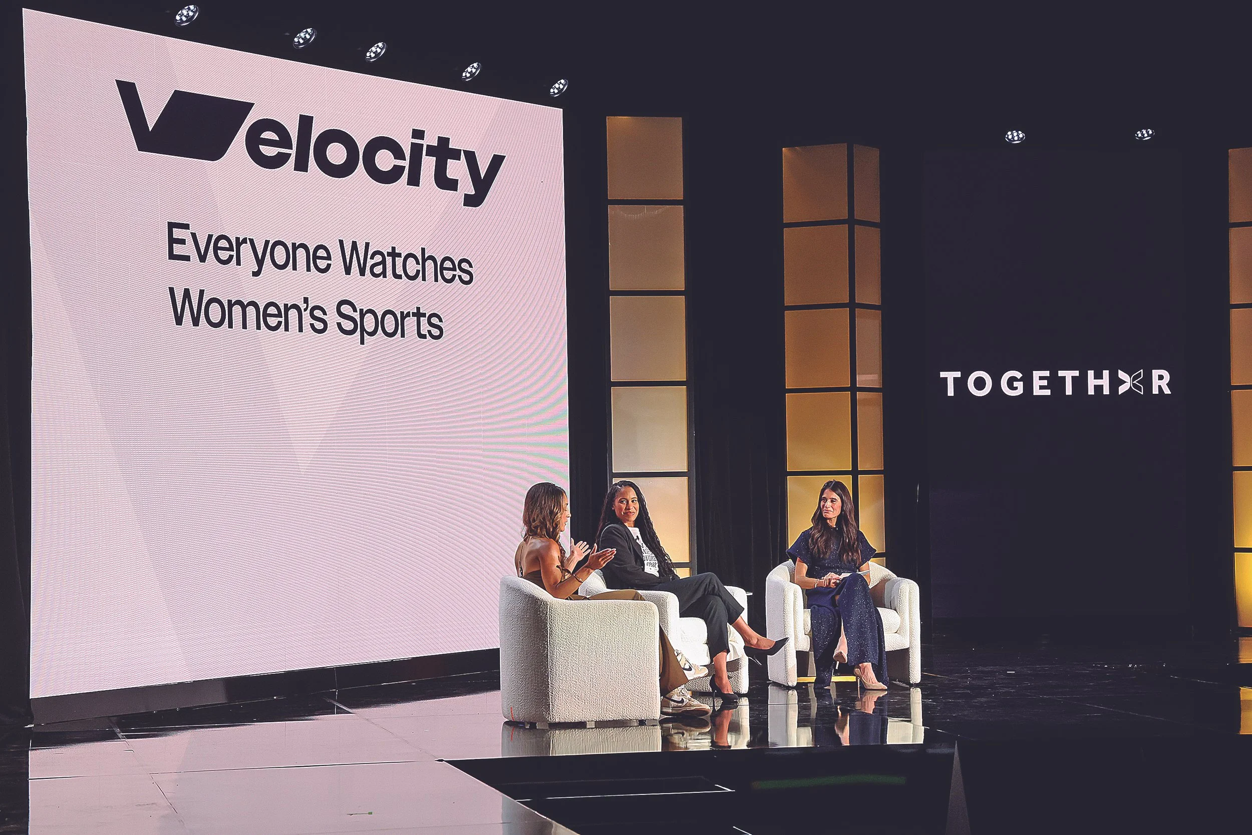 Co-Founder of Velocity, Andrea Trujillo, leads a discussion on the explosive growth of women in sports alongside Kati Fernandez, Chief Content Officer at TOGETHXR, and Monica Medellin, Film Director, Executive Producer, and Creator of Surf Girls, Prime Video’s first women’s sports docuseries.